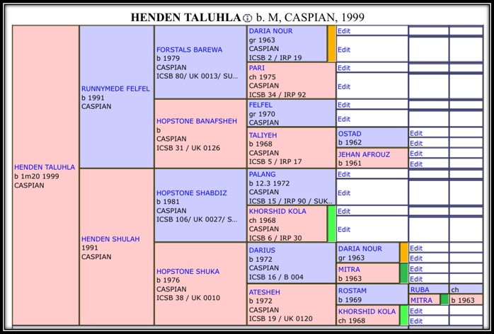 Taluhla est une jument caspienne née en 1999 et vient de l’élevage Henden en Angleterre (Henden Stud) où les modèles un peu plus grands étaient appréciés. Elle est fille de Felfel et petite fille de Shabdiz, les 2 étalons les plus titrés de la race. Sa souche basse est celle de Korshid Kola* et d’Ateshe, les 2 juments offertes à SAR le Prince Phillip. Korshid Kola* était réputée pour être une des plus belles juments parmi celles inscrites à titre initial. Taluhla produit des poulains à son image, racés, plutôt grands et élancés, avec de très beaux tissus. Sa production est remarquablement primée en concours d’élevage. Agée de 23 ans, elle tient toujours le leadership du troupeau et conserve toute sa splendeur. C’est assurément la grande dame de notre élevage.